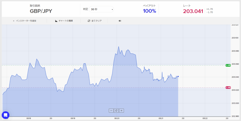 ペイアウト率は100%と勝てば資金が倍になります。ペイアウト率が高い分、難易度は高めの取引になります。