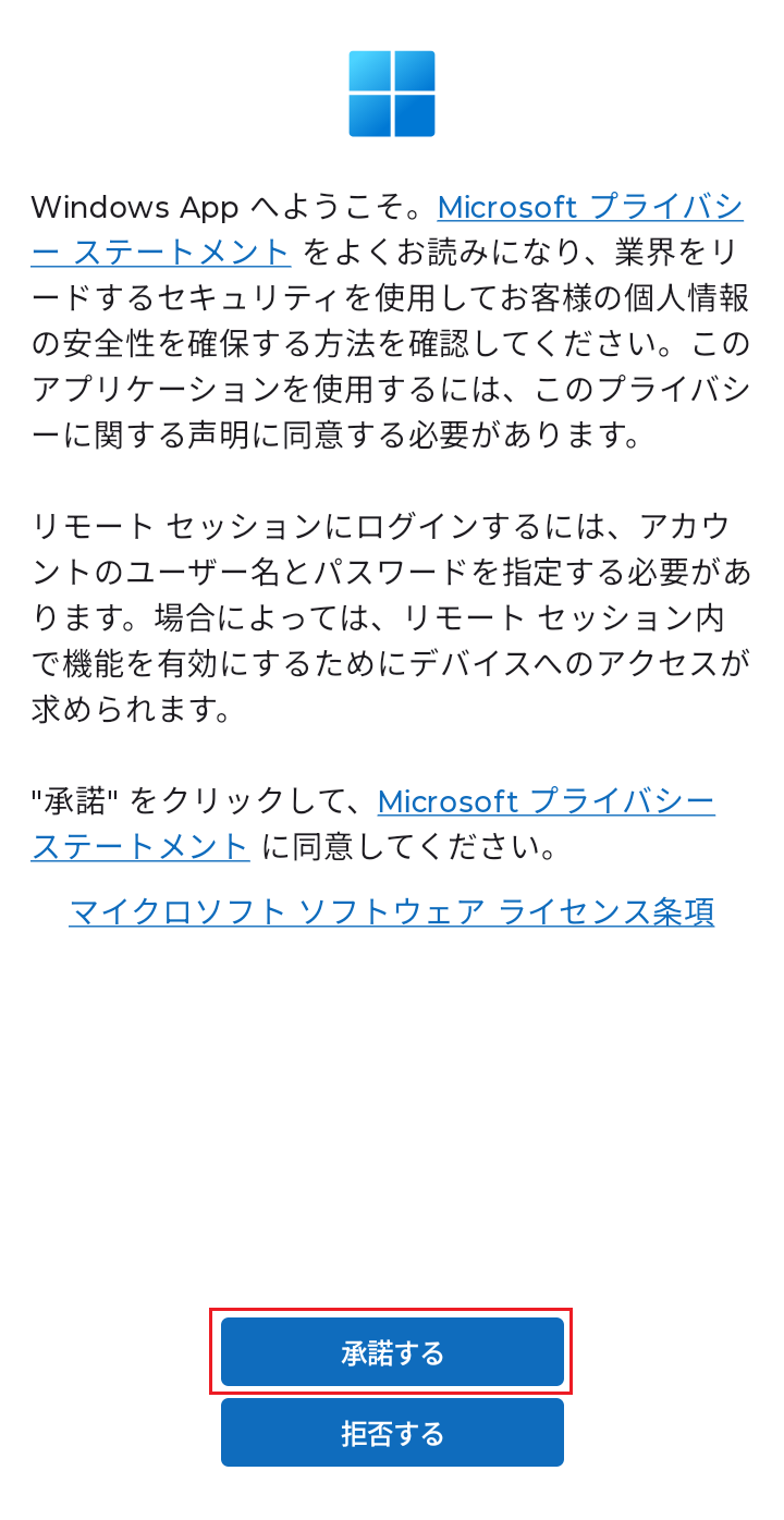 初めて「Windows App」を開くと次の画面が表示されるので[承諾する]をタップします。