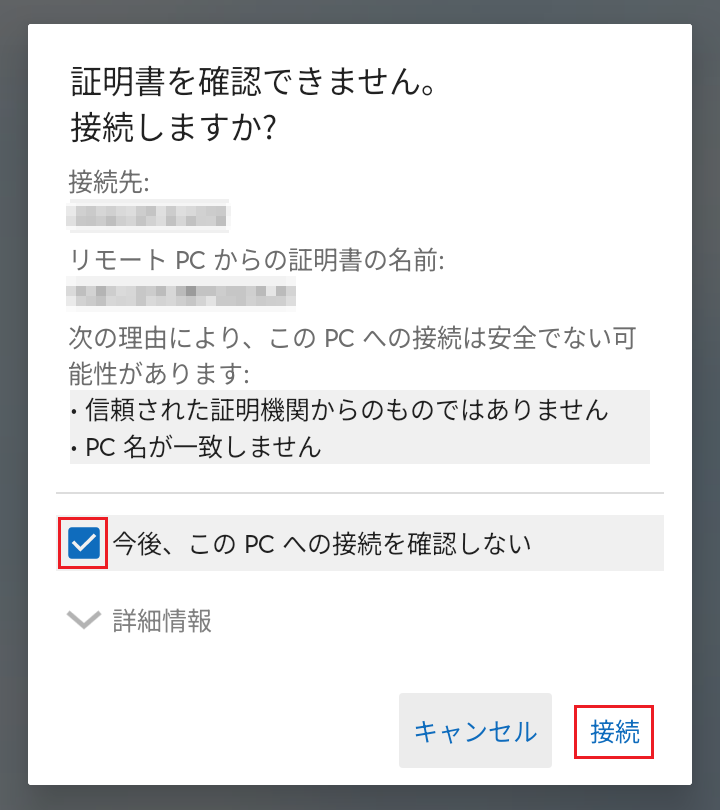接続中に次の画面が表示されたら[今後、このPCへの接続を確認しない]にチェックを入れて[接続]をタップします。