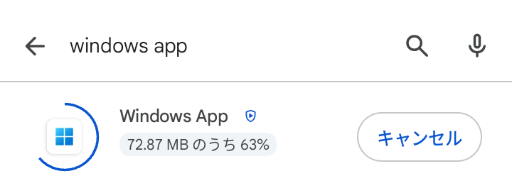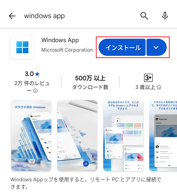 検索窓に[windows app]と入力すると[Windows App]のアプリが表示されます。[インストール]をタップしてインストールします。