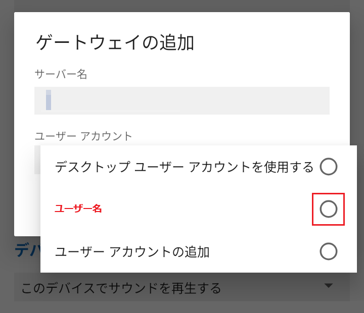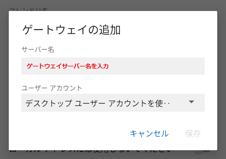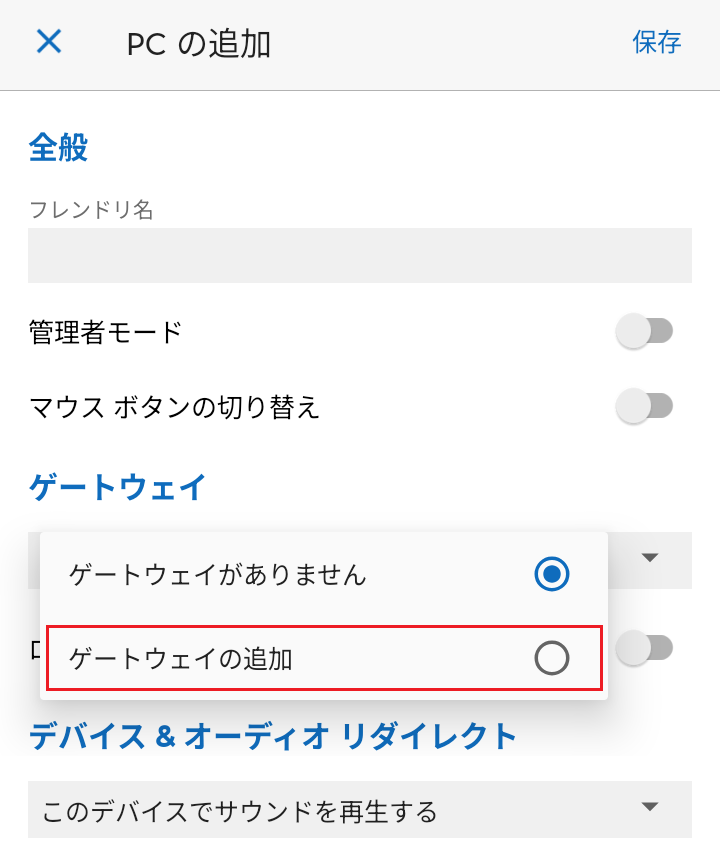 リモート接続する際にゲートウェイを経由している場合、ゲートウェイの情報を入力する必要があります。