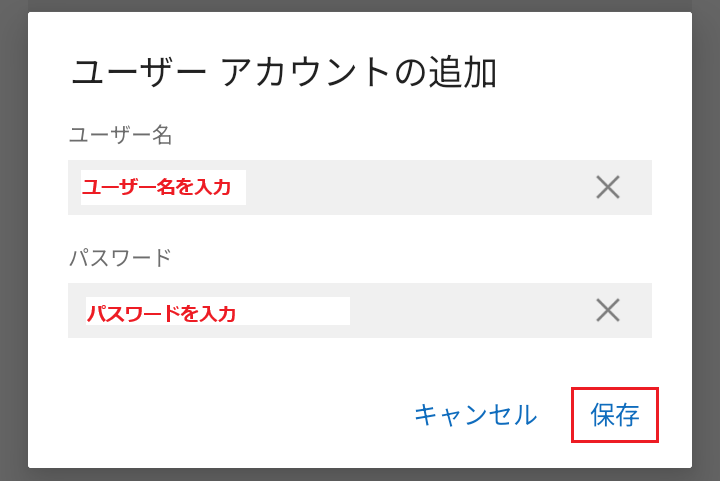 「ユーザーアカウントの追加」でリモート接続PCにログインする[ユーザー名]と[パスワード]を入力します。
